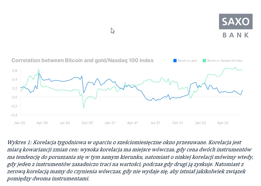 Pierwotnym celem utworzenia bitcoina jako pierwszej zdecentralizowanej kryptowaluty było przekazywanie pieniędzy przez Internet poza jakąkolwiek centralną kontrolą. Podobnie jak w przypadku fizycznego złota, podaż bitcoina jest ograniczona; oba te aktywa cieszą się popularnością w krajach o wysokiej inflacji. W związku z tym bitcoin określono mianem "złota XXI wieku". Z technicznego punktu widzenia korelacja pomiędzy bitcoinem a fizycznym złotem była znacząca przez cały 2020 r. i do początku 2021 r., jak widać na wykresie 1.