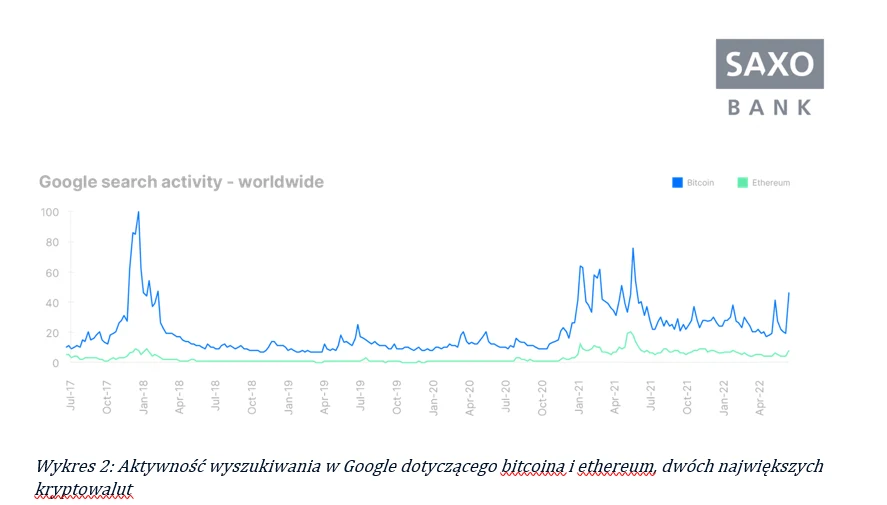 Mocny spadek na rynkach kryptowalut w tym roku wyeliminował część inwestorów spekulacyjnych czerpiących zyski na fali trendów wzrostowych w 2020 i 2021 r. Analiza aktywności wyszukiwania w Google jako metoda kwantyfikacji zainteresowania publicznego wykazuje, że zainteresowanie kryptowalutami spadło do umiarkowanego poziomu, co widać na wykresie 2.