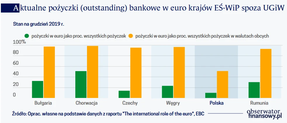 Podobna sytuacja jest na rynku depozytów bankowych. W grudniu 2019 r. depozyty eurowe tworzyły 7,9 proc. wszystkich depozytów.