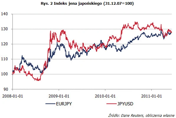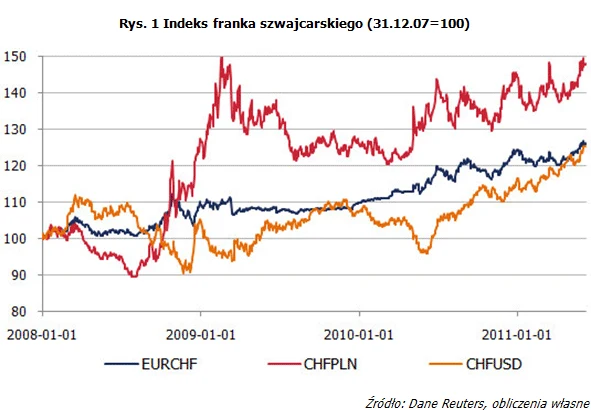 Nic więc dziwnego, że rynki nurtuje pytanie: "skąd się bierze siła franka?" Do pewnego stopnia tłumaczyć to zjawisko może fakt, iż inne waluty uznawane za bezpieczne również zyskiwały na wartości (z wyjątkiem funta do dolara) w okresie silnych turbulencji na rynkach światowych. Przyjmując za punkt wyjścia, czyli okres bazowy, kurs z dnia 31 grudnia 2007 r. i tworząc prosty indeks jednopodstawowy: