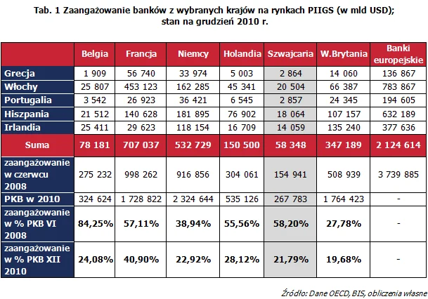 Jeszcze dobitniej niż w przypadku wszystkich krajów PIIGS tendencja ta uwidacznia się w zaangażowaniu banków szwajcarskich na rynku greckim. W tym wypadku spadek zaangażowania nastąpił z poziomu 59,9 mld USD do zaledwie niespełna 2,9 mld USD w grudniu 2010 r.