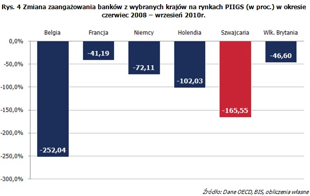 Tamtejsze banki nie angażowały się tak znacząco w inwestycje na rynkach krajów PIIGS jak banki francuskie czy niemieckie. Ponadto, banki szwajcarskie w ciągu ponad dwóch i pół roku, jakie minęły od wybuchu światowego kryzysu finansowego obniżyły swoje zaangażowanie na peryferiach Eurolandu do najniższego poziomu. Spadło ono ze 154,9 mld USD w czerwcu 2008 r., czyli tuż przed początkiem kryzysu do 58,3 mld USD w grudniu 2010 r. jak wynika z najnowszego przeglądu kwartalnego Banku Rozrachunków Międzynarodowych (BIS). Banki dokonały repatriacji aktywów zamykając swoje pozycje za granicą.