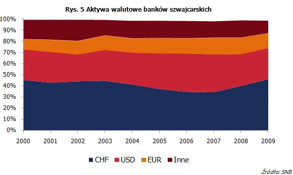 Jeszcze w 2007 r. aktywa denominowane we franku stanowiły nieco ponad 34 procent wszystkich aktywów. Od tego momentu wzrosły jednak do prawie 46 procent w 2009 r. jak podaje Szwajcarski Bank Narodowy (SNB). Równocześnie odnotowano spadek udziału aktywów dolarowych i denominowanych w euro. Frank stał się dominującą walutą w przepływach między lokalnymi inwestorami.