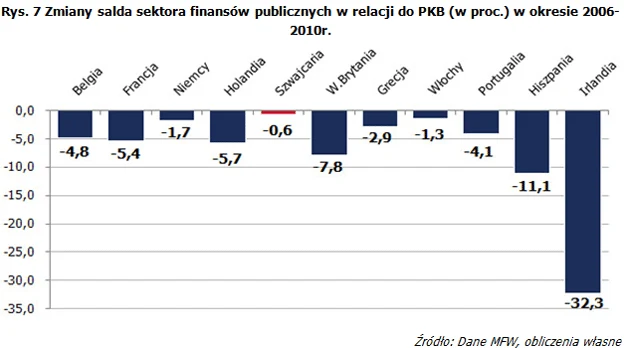 Szwajcaria, jako jedno z nielicznych państw rozwiniętych nie doświadczyła w okresie światowego kryzysu finansowego deficytu sektora finansów publicznych. Co prawda nadwyżka stopniała z 0,8 procent PKB w 2006 r. do poziomu 0,2 procent w 2010 r. niemniej jednak nadal była to nadwyżka, a nie deficyt.