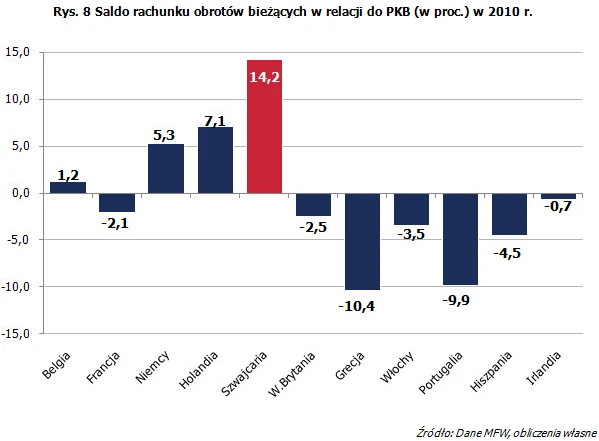 Również w zakresie równowagi zewnętrznej gospodarka szwajcarska prezentuje się bardzo dobrze. Od lat utrzymuje się nadwyżka na rachunku obrotów bieżących m.in. dzięki pozytywnemu wkładowi eksportu. W 2010 r. SNB zanotował nadwyżkę w relacji do PKB równą 14,2 procent.