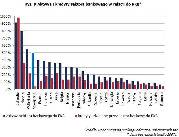 Wielkość aktywów sektora bankowego w relacji do PKB jest istotnym czynnikiem mogącym oddziaływać na kurs walutowy. Jeśli spojrzymy na wykres poniżej to zobaczymy, iż trzy pierwsze państwa z największymi aktywami sektora bankowego w relacji do PKB miały olbrzymie problemy m.in. w związku z nadmierną wielkością swojego sektora bankowego. Islandia praktycznie zbankrutowała, Irlandia otrzymuje pomoc, a W. Brytania jest wciąż w recesji. Ryzyko wynika z faktu, iż w przypadku gdyby aktywa traciły na wartości rząd będzie musiał interweniować, aby chronić system bankowy tak jak to miało miejsce w przypadku Islandii.