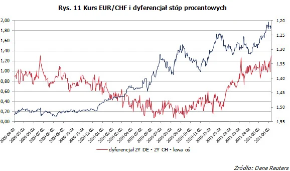Reasumując - źródłem siły franka jest nie tylko fakt, iż jest to waluta uznawana za bezpieczną. Również nadwyżka bilansu płatniczego, wciąż rosnący eksport, niska stopa bezrobocia, przyzwoity poziom wzrostu gospodarczego oraz dobra sytuacja finansów publicznych stanowią solidne fundamenty ekonomiczne, na których zbudowana jest pozycja szwajcarskiej waluty. Różnica dyferencjału stóp procentowych wskazuje jednak, iż notowania EUR/CHF powinny być wyższe, czyli frank powinien być słabszy. Wartość uzyskana z dyferencjału wynosi 1,3040, podczas gdy kurs spot 1,2241 (stan na dzień 9 czerwca 2011 r.). W ujęciu procentowym rozbieżność wynosi więc 6 procent.