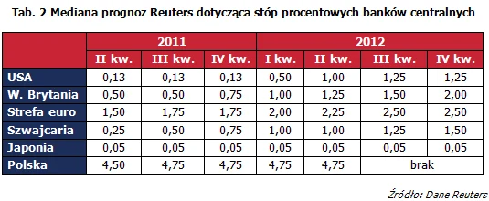 Brak presji inflacyjnej w gospodarce pozwala przypuszczać, iż ekspansywna polityka pieniężna zostanie utrzymana jeszcze, przez co najmniej kilka miesięcy. Oczekujemy, że Szwajcarski Bank Centralny (SNB) rozpocznie ostrożny proces normalizacji polityki pieniężnej w ostatnim kwartale bieżącego roku podnosząc stopę procentową z obecnego poziomu 0,25 procent do 1 procent na koniec 2012 roku.