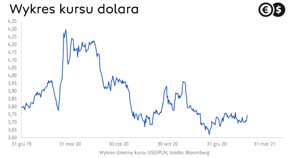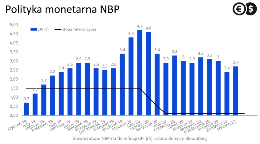 Narodowy Bank Polski w odpowiedzi na pandemiczne kryzys poluzował w poprzednim roku politykę: stopy procentowe zostały zredukowane z 1,5 do 0,10 proc., rozpoczęto agresywny skup aktywów. Na przełomie lat 2020 i 2021 do tego arsenału dołączono interwencje walutowe. Oficjalne stanowisko było takie, że postępujące wówczas spadki kursów EUR/PLN i USD/PLN zaczęły zagrażać zaburzeniem mechanizmów transmisji polityki monetarnej lub, mówiąc oględniej, niweczyć wysiłki NBP. Słabszy złoty ma też pomóc firmom wysyłających towary za granicę i w ten sposób dodatkowo podbić dynamikę PKB. Należy pamiętać, że do progu opłacalności eksportu deklarowanego w badaniach ankietowych (kurs EUR/PLN w okolicy 4,00) było w grudniu jeszcze bardzo daleko. Jednocześnie prezes Adam Glapiński zasugerował, że w pierwszej części roku możliwe jest dalsze cięcie stóp procentowych.