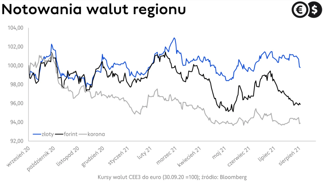 Po drugie, za sprawą serii odczytów barometrów nastrojów w przemyśle i usługach ze wszystkich zakątków globu napływać mogą chłodzące apetyt na ryzyko informacje. Mogą one sugerować, że rozprzestrzenianie się wariantu delta koronawirusa staje się coraz poważniejszym balastem dla wzrostu gospodarczego. Przede wszystkim niepokoić może gasnąca koniunktura w Chinach. Pod lupą będą także dzisiejsze i jutrzejsze odczyty indeksów ISM dla Stanów Zjednoczonych. Analogiczny wskaźnik dla Polski, czyli PMI dla przemysłu spadł we wrześniu mocniej, niż oczekiwano (z 57,6 do 56,0 pkt), ale nadal zdecydowanie bliżej mu do historycznych szczytów z czerwca (59,4 pkt) niż pułapów, które wskazywałyby, że sektor zaczyna się kurczyć.
