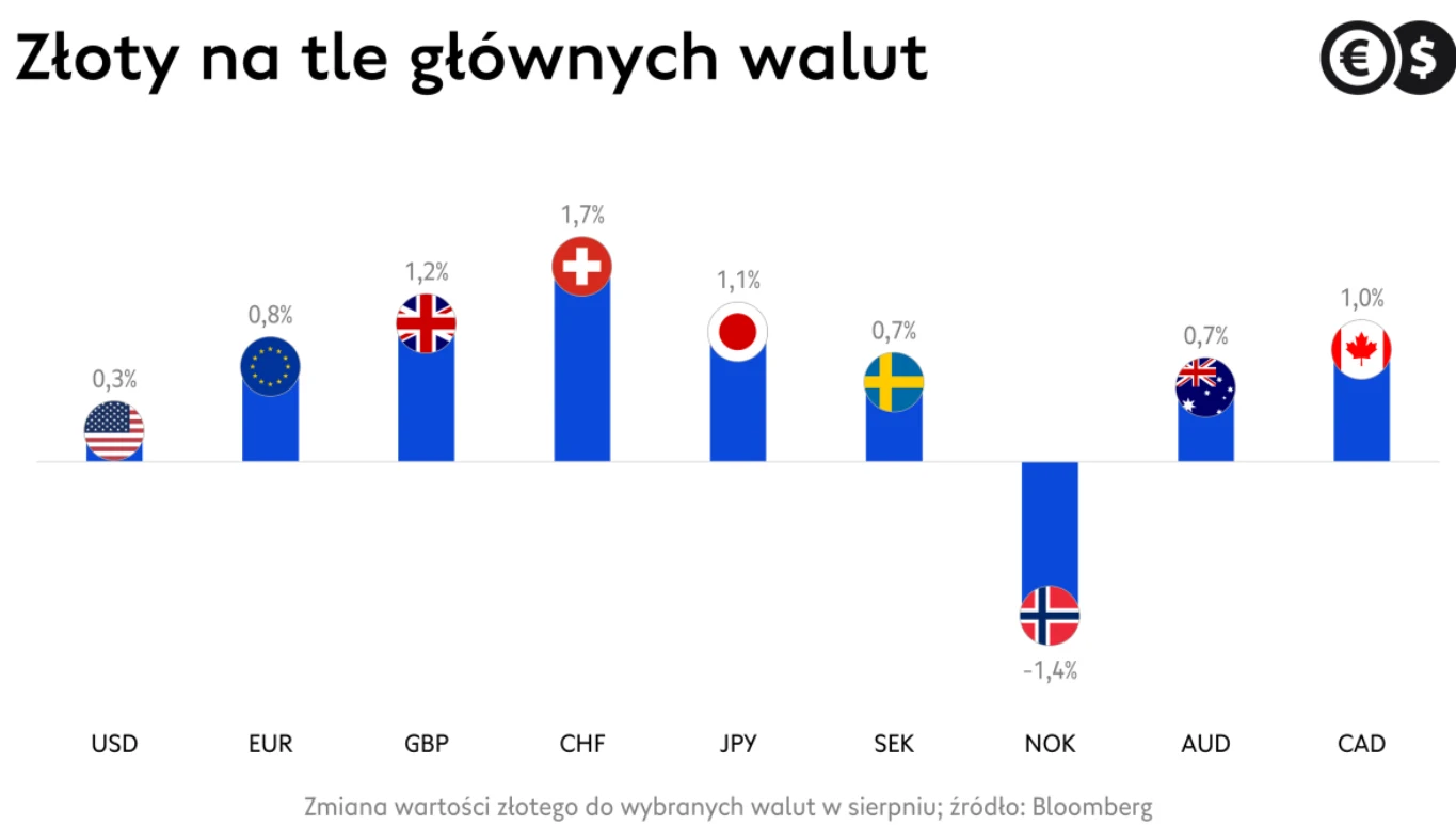 Oznacza to, że w ostatnim miesiącu, głównie za sprawą najświeższych przetasowań po sympozjum w Jackson Hole i sierpniowym rekordzie inflacji euro potaniało o prawie 1 proc., a frank oraz funt zostały przecenione o ok. 1,5 proc.