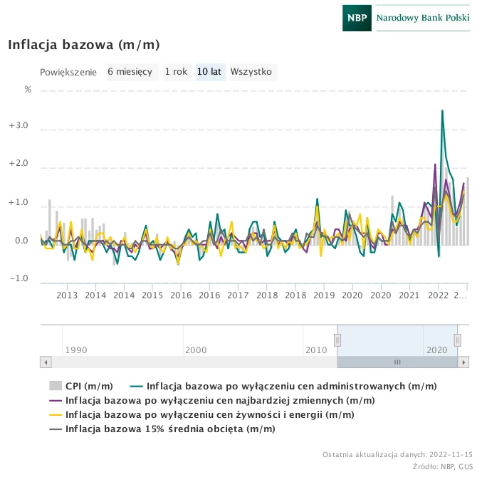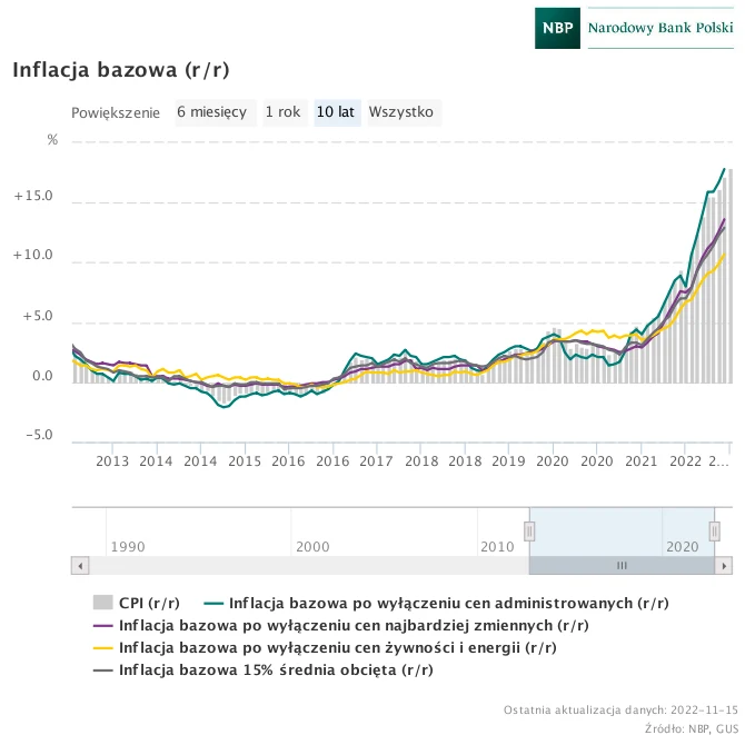 Jak podał Narodowy Bank Polski, inflacja bazowa liczona po wyłączeniu cen administrowanych (podlegających kontroli państwa) wyniosła we wrześniu br. 17,8 proc., wobec 16,7 proc. miesiąc wcześniej; po wyłączeniu cen najbardziej zmiennych wyniosła 13,6 proc., wobec 12,6 proc. miesiąc wcześniej.Z kolei inflacja bazowa po wyłączeniu cen żywności i energii wyniosła 10,7 proc., wobec 9,9 proc. miesiąc wcześniej, a tzw. 15-proc. średnia obcięta, która eliminuje wpływ 15 proc. koszyka cen o najmniejszej i największej dynamice, wyniosła 12,9 proc., wobec 12,3 proc. miesiąc wcześniej.